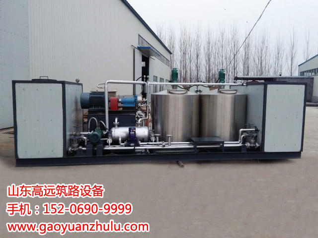 瀝青加溫罐、乳液摻配罐、水加溫罐、乳化劑反應釜(兩個)、成品罐、調速瀝青泵、調速乳液泵、乳化機(兩臺)、管道泵、攪拌泵、成品輸送泵、數(shù)控系統(tǒng)、大底板、管道、閥門、過濾系統(tǒng)等組成。
